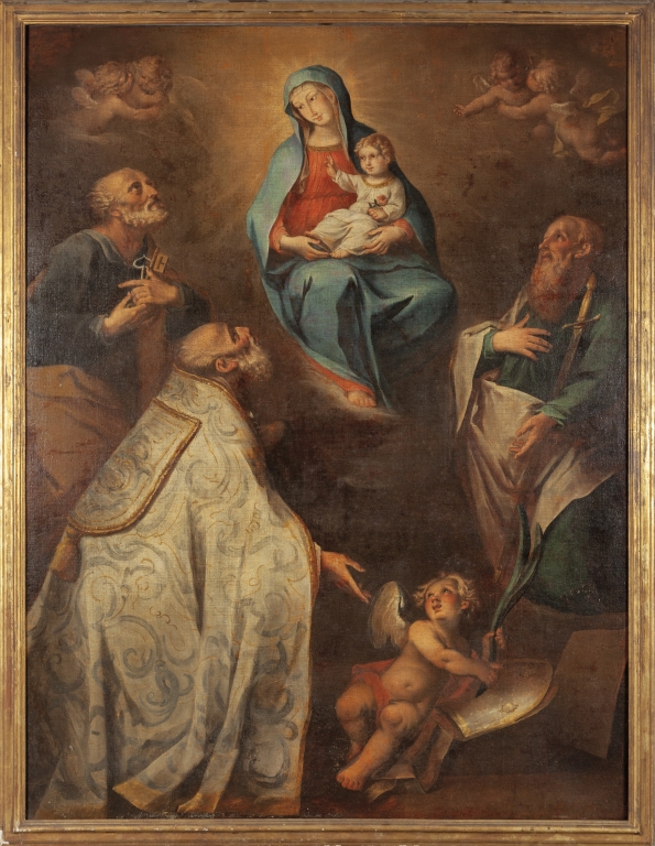 'La Madonna appare ai Santi Pietro e Paolo e a San Silvestro' pala d'altare olio sec.XVIII