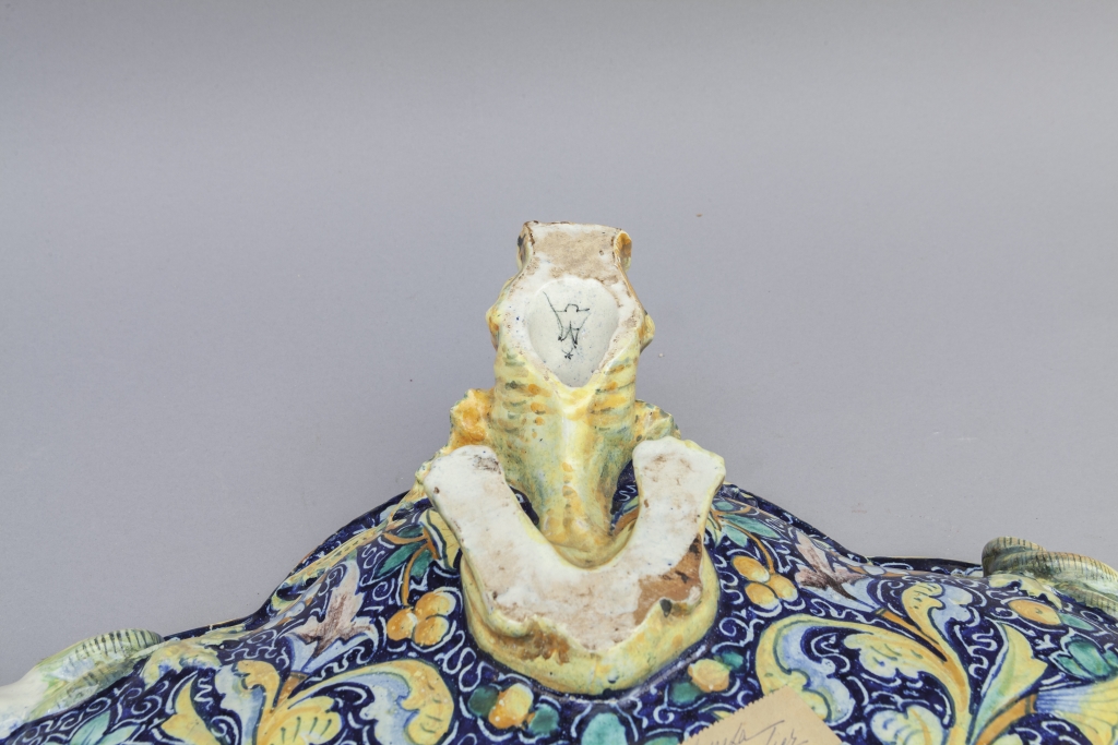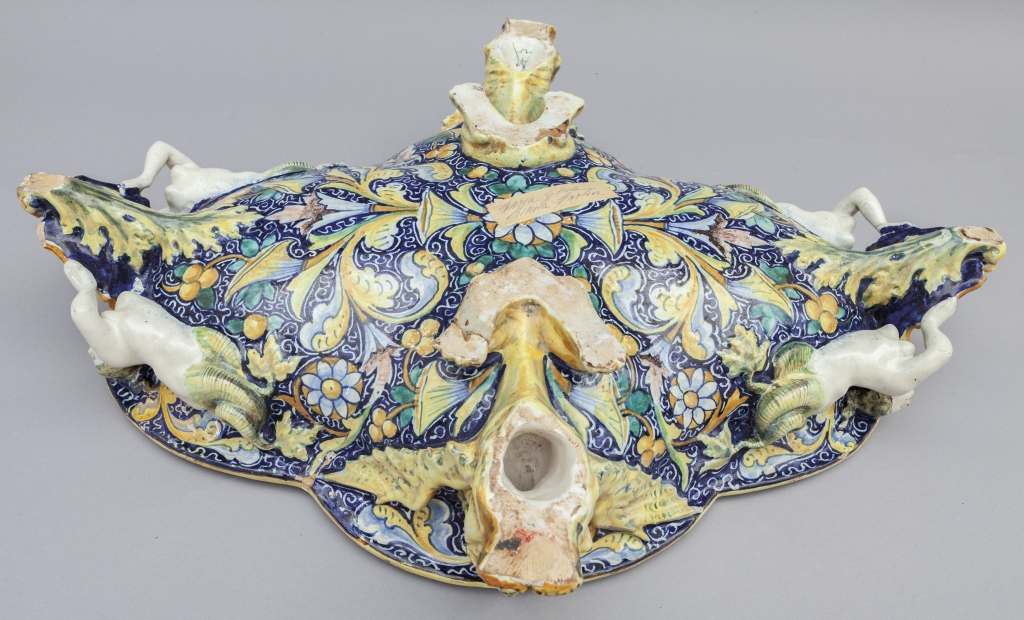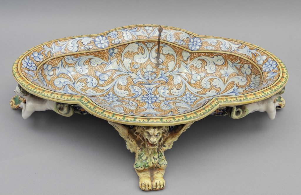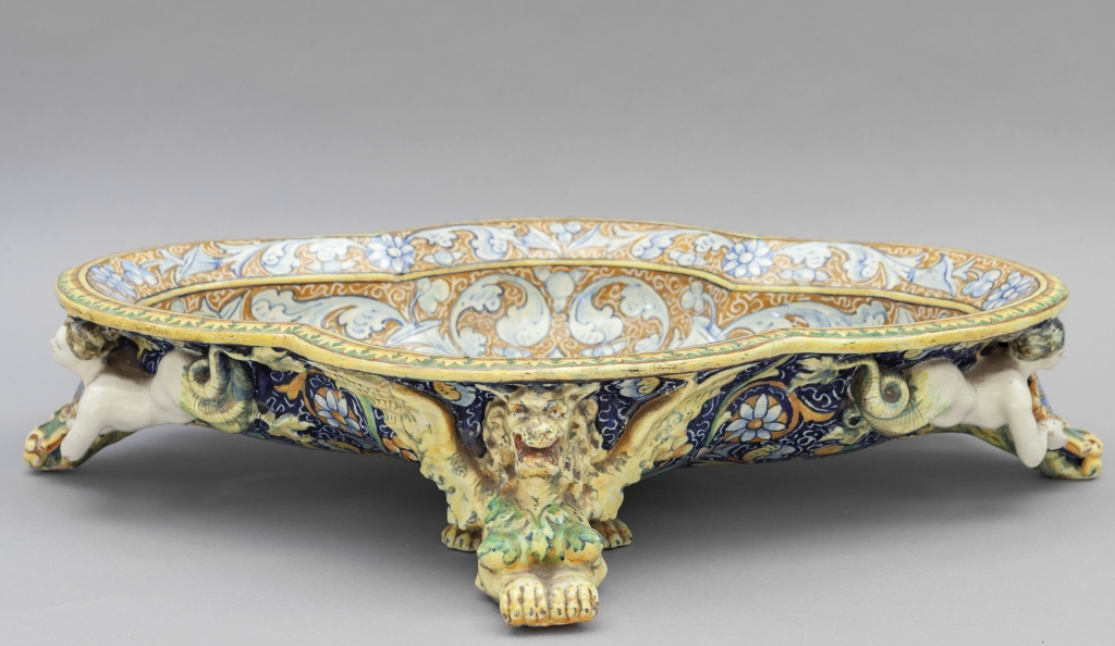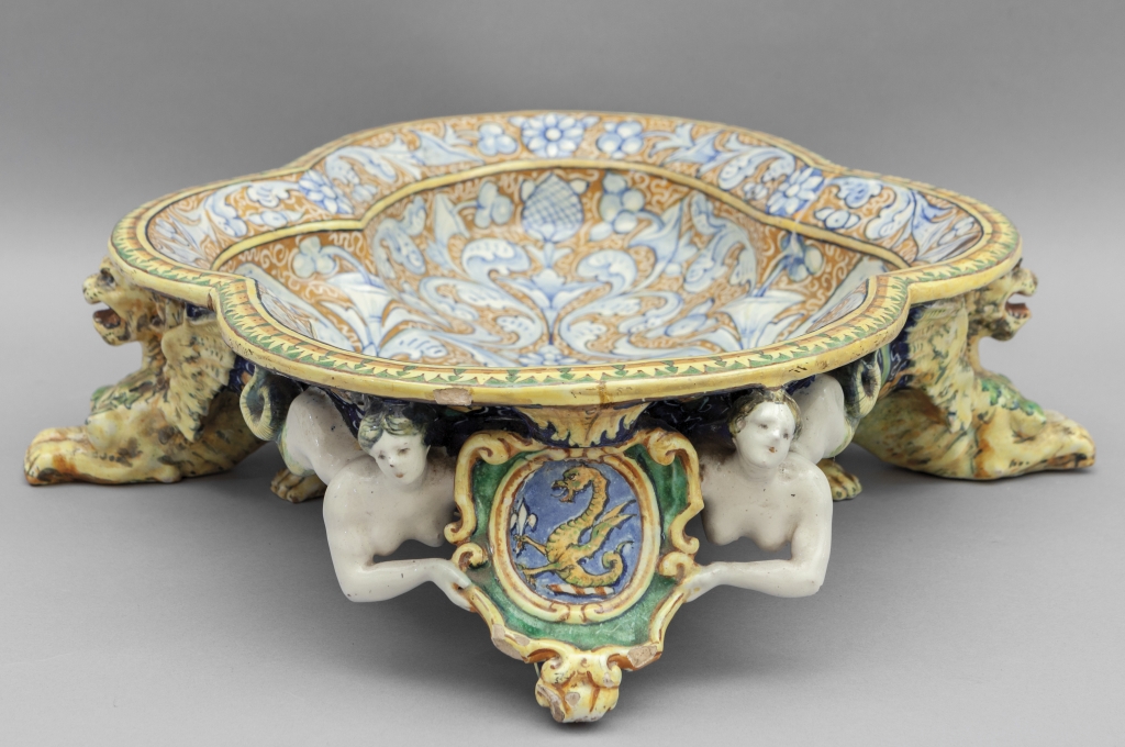 Centrotavola in ceramica policroma in stile rinascimentale f.to Minghetti Bologna