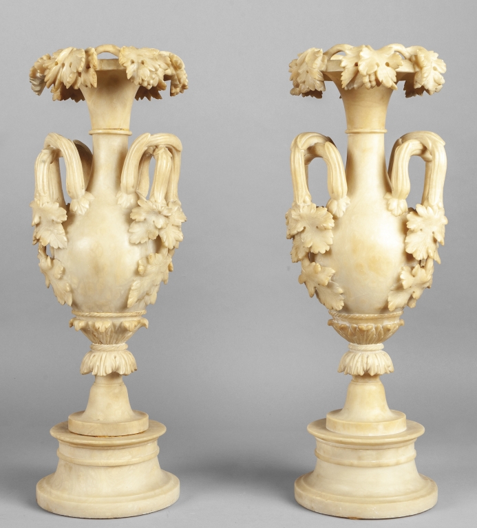 Coppia di vasi in alabastro finemente scolpiti con manici e fogliame Volterra sec.XIX