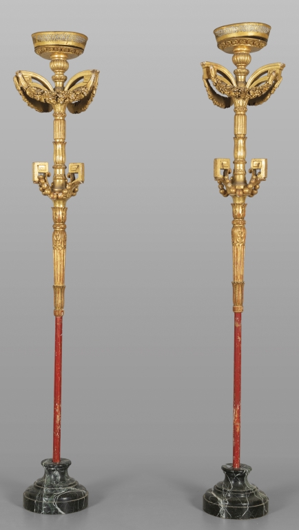 Coppia di grandi torcere Luigi XVI in legno intagliato e dorato poggianti su basi in marmo tornito Genova fine sec.XVIII