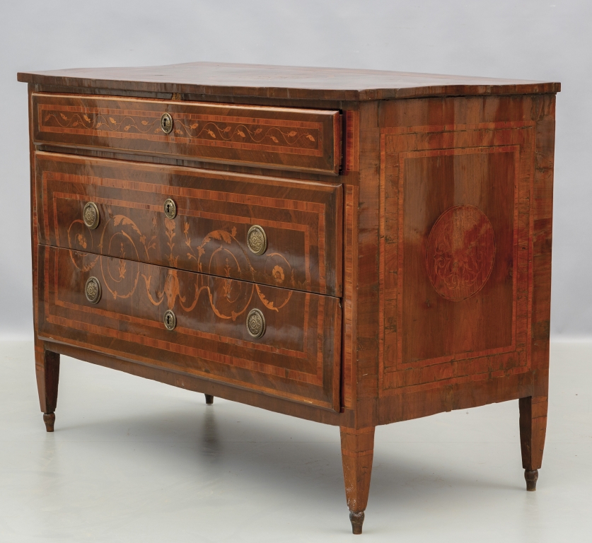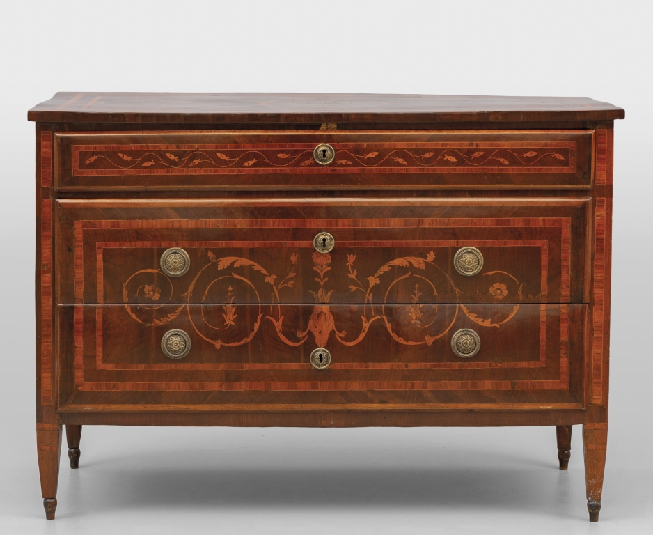 Comò Luigi XVI lastronato in palissandro e filettato in legni vari con rosone sul piano e sui fianchi ed intarsio a girali con motivi floreali sul fronte Lombardia II metà sec.XVIII