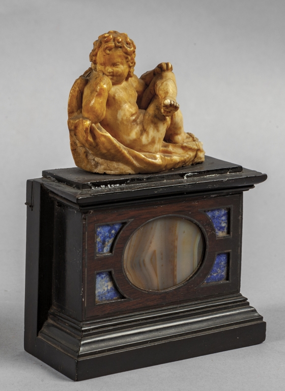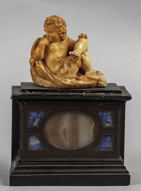 Putto pensieroso scultura in avorio poggiante su base in legno ebanizzato con intarsi in lapislazzulo e pietra dura Roma inizi sec.XVIII