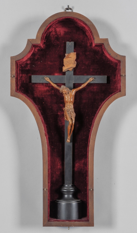 A.Fantoni (Bergamo inizi sec.XVIII attr.) 'Cristo in Croce' scultura in bosso dentro teca in legno
