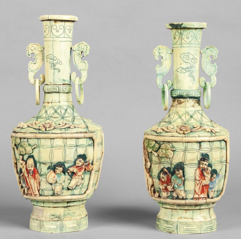 Precedente Lotto 506 Successivo Aste Boetto - Via Mura dello Zerbino 10R, 16122 Genova Antiquariato, Pittura del sec.XIX e Arte Orientale Terza sessione giovedì 26 settembre 2019 ore 15:30 (UTC +01:00) OGGETTISTICA Coppia di vasi cinesi in osso inizi sec.XXh.cm.29
