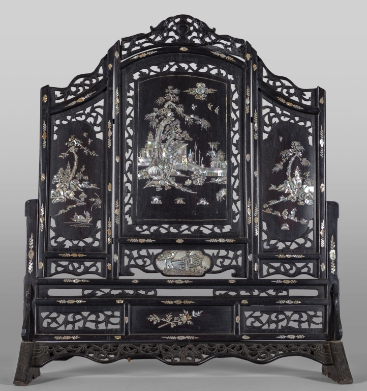 Parafuoco in legno ebanizzato ed intarsiato in madreperla a paesaggio Cina sec.XX