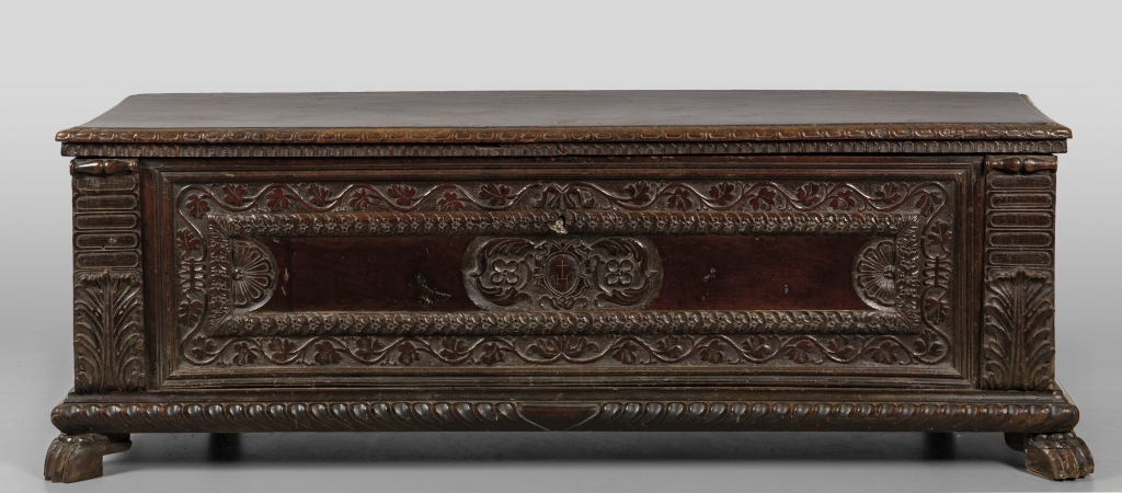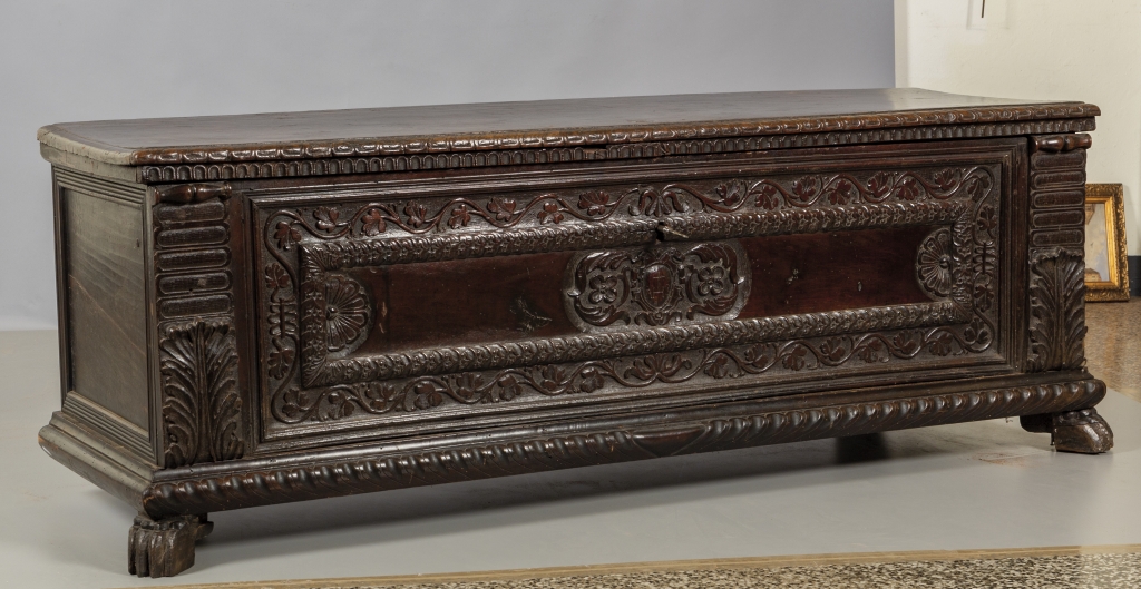 Cassapanca in noce intagliato Lombardia sec.XVII