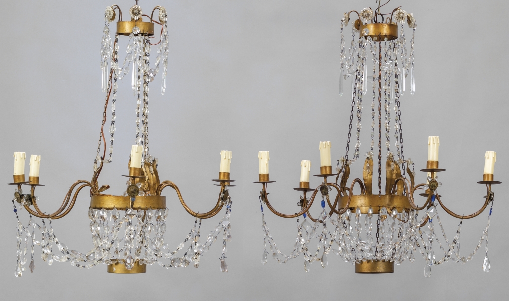 Coppia di lampadari a cestino a sei luci in metallo dorato e cristalli sec.XIX