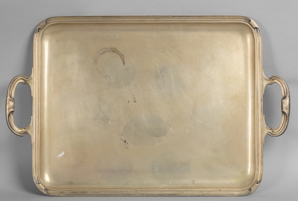 Precedente Lotto 591 Successivo Aste Boetto - Via Mura dello Zerbino 10R, 16122 Genova Antiquariato, Pittura del sec.XIX e Arte Orientale Terza sessione giovedì 26 settembre 2019 ore 15:30 (UTC +01:00) OGGETTISTICA Vassoio in argento con manicicm.60x39 gr.2500