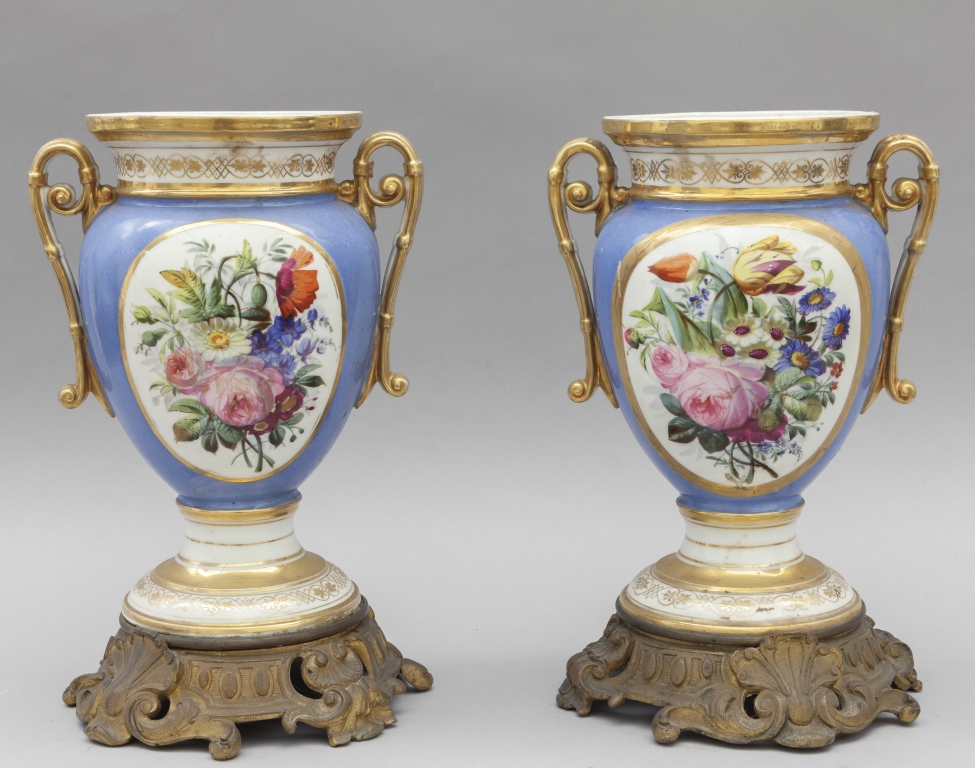 Coppia di vasi Luigi Filippo in porcellana decorati a fiori su fondo azzurro Francia sec.XIX