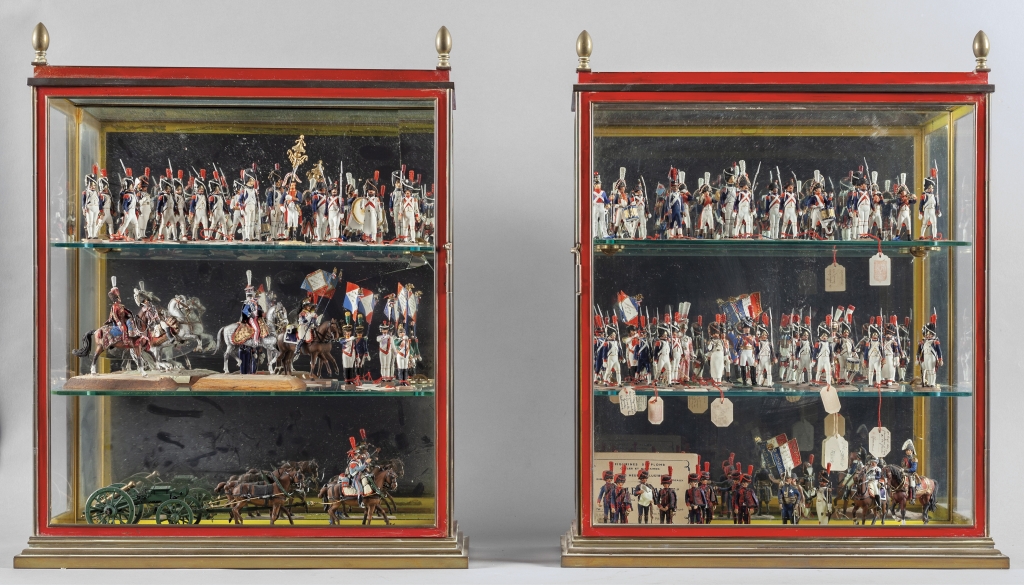Coppia di teche in bronzo e vetro contenenti soldatini