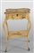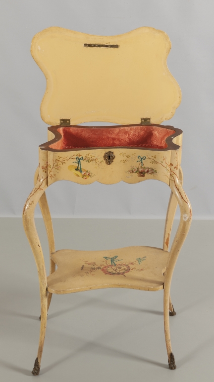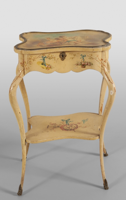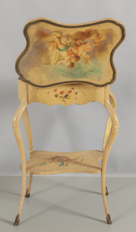 Tavolino da lavoro in legno laccato in policromia con putti nastri e fiori su fondo crema inizi sec.XX