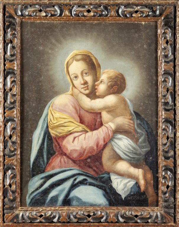 'Madonna con Bambino' olio sec.XVIIII cornice coeva in legno intagliato dorato e laccato