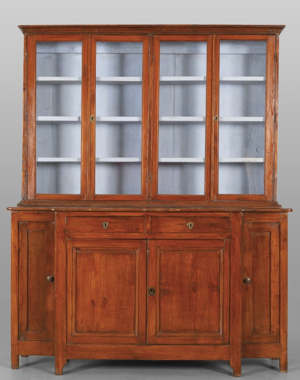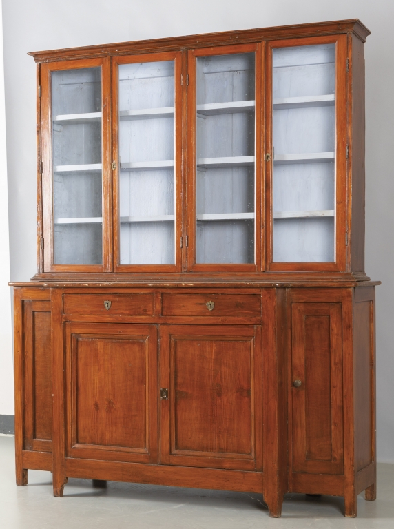 Credenza con alzata in legno dolce parte superiore a quattro sportelli con vetri parte inferiore a due ante e due cassetti sec.XIX