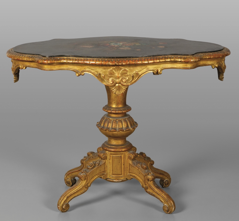 Tavolino Luigi Filippo a biscotto in legno intagliato e dorato piano decorato in policromia a fiori sec.XIX