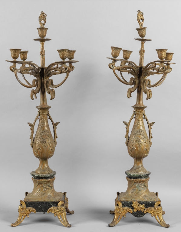 Coppia di candelieri Liberty in bronzo e marmo a cinque luci fine sec.XIX