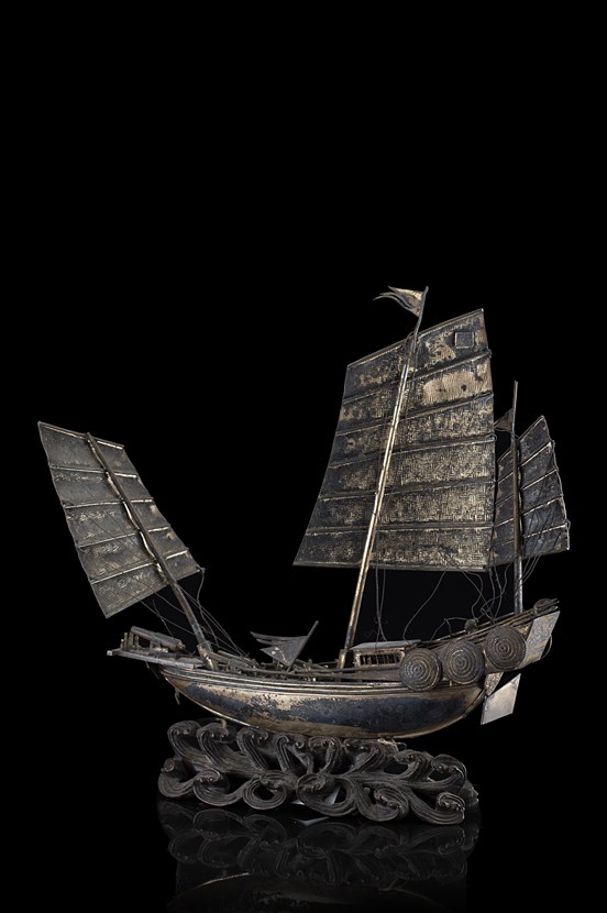 Modello di Sampan in argento con base in legno scolpita ad onde (difetti)...