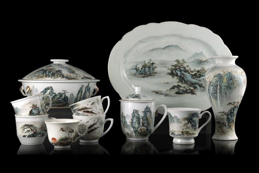 Servizio in porcellana policroma composto da vassoio, terrina con coperchio, tazzine e piccolo vaso decorato con paesaggio e calligrafia (tot. dieci pezzi)