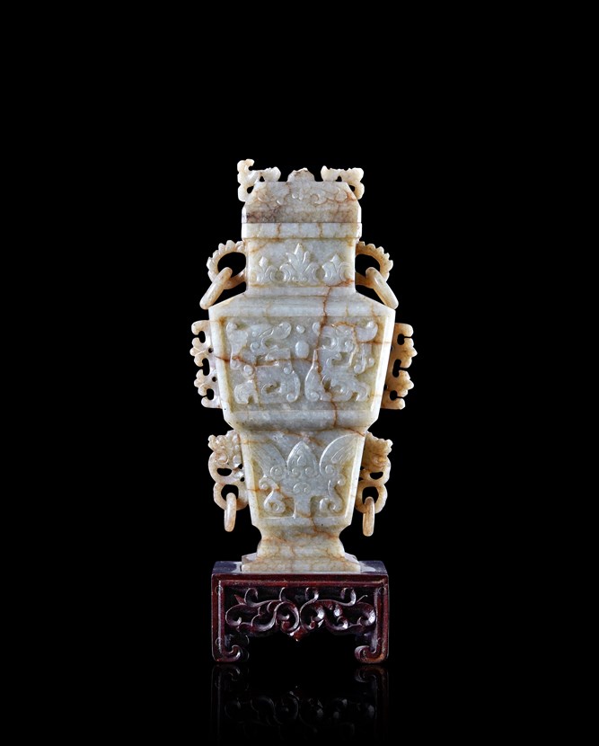 A jade vase decorated with archaistic motifs, wood base (defects and losses)