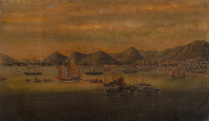 Scuola cinese Veduta di Hong Kong olio su tela (difetti) Cina, secolo XIX...