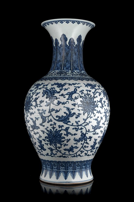 Grande vaso a balaustro in porcellana bianca e blu decorato con fiori di loto stilizzati tra rami, una banda di ruyi alla spalla, il collo con motivo a palmette