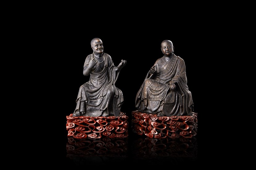 Coppia di monaci buddhisti in bronzo con basi in legno, con iscrizioni alla base riferite al tempio buddhista di Ziji An (lievi difetti)
