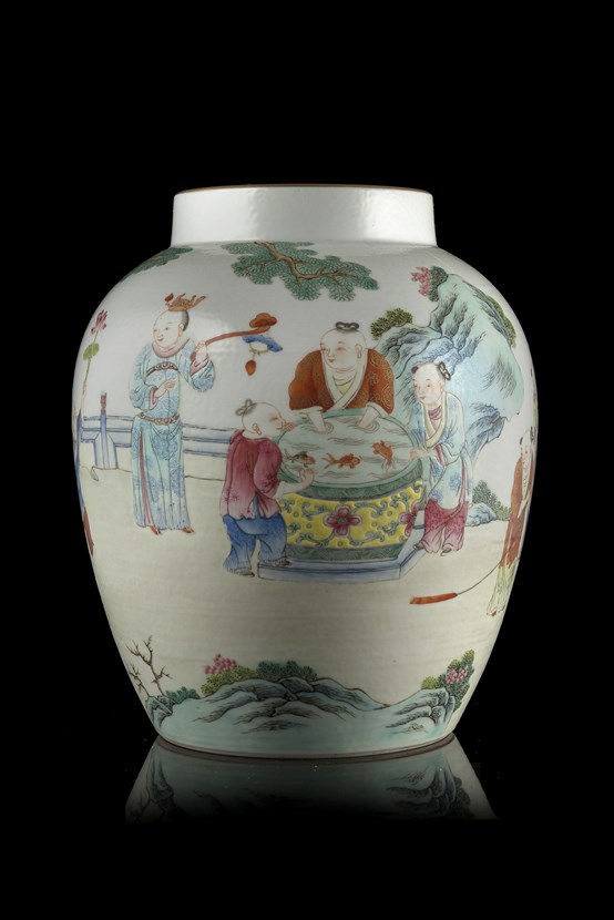 Potiche in porcellana Famiglia Rosa decorata con scena di fanciulli in un giardino, marchio apocrifo Qianlong alla base