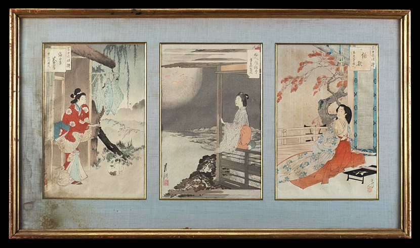 Tre stampe a colori raffiguranti dame, una firmata Gekko, in cornice (difetti)