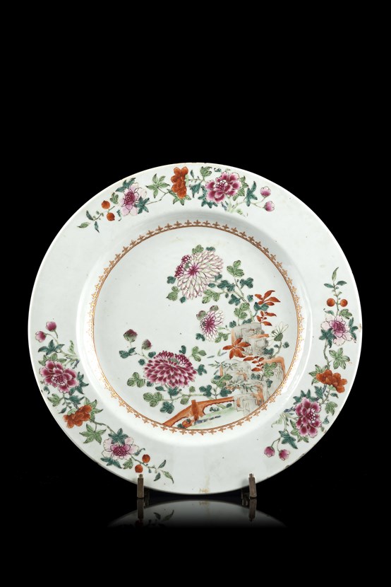 Piatto in porcellana Famiglia Rosa con decoro centrale di peonie in fiore con bordatura a testa di lancia (lievi difetti)