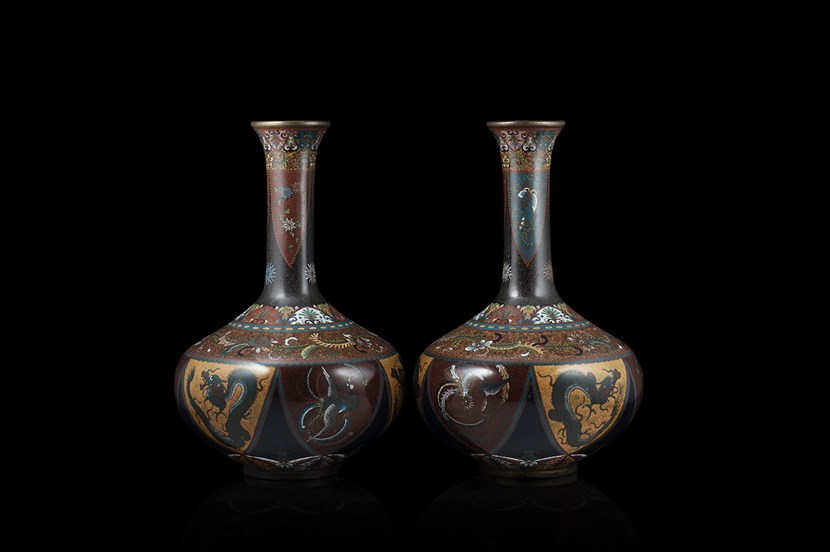 Lotto 1074 | Coppia di vasi a collo alto in metallo a decoro cloisonnè (lievi difetti)...