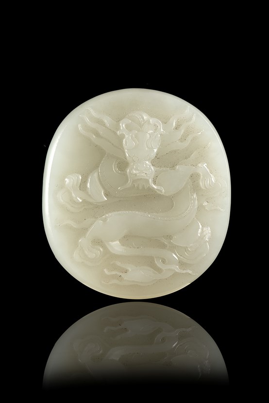 Placca in giada bianca con drago e bambù Cina, secolo XX (l. max 4,9 cm.) -EN...