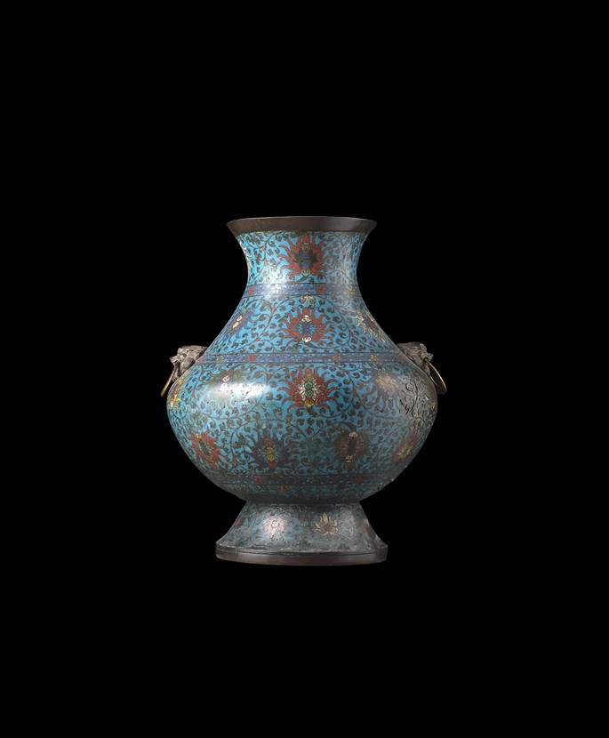 Vaso in metallo cloisonné decorato a motivi fogliati con anse a teste di...