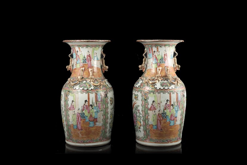 Coppia di vasi biansati in porcellana Famiglia Rosa cantonese decorati con figure in scene di palazzo (difetti)