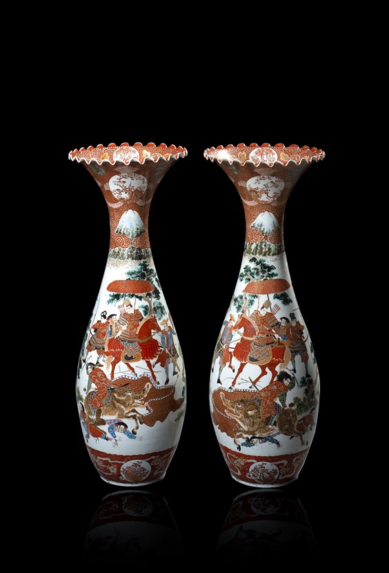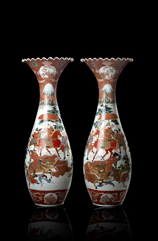 Coppia di vasi a tromba con il bordo lobato in porcellana policroma decorata con scene di battaglia (difetti)