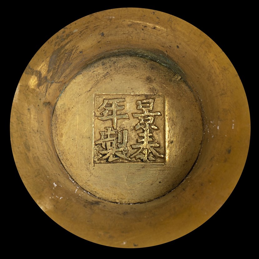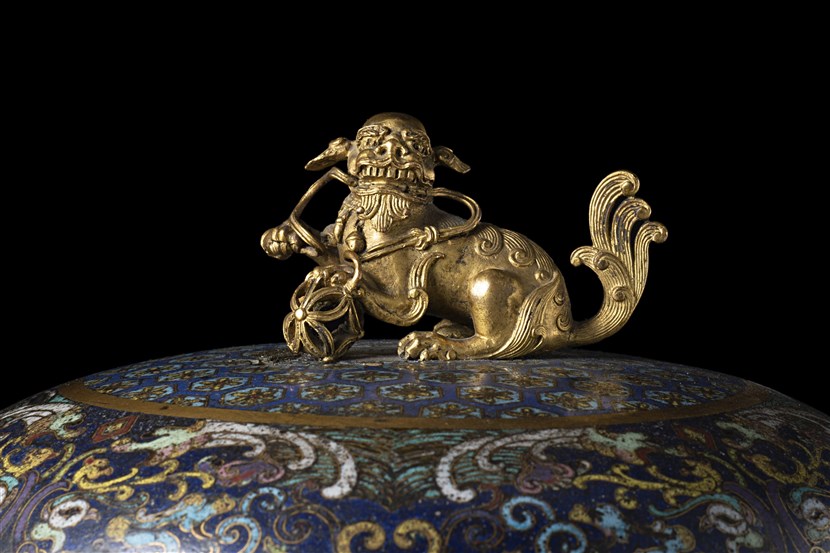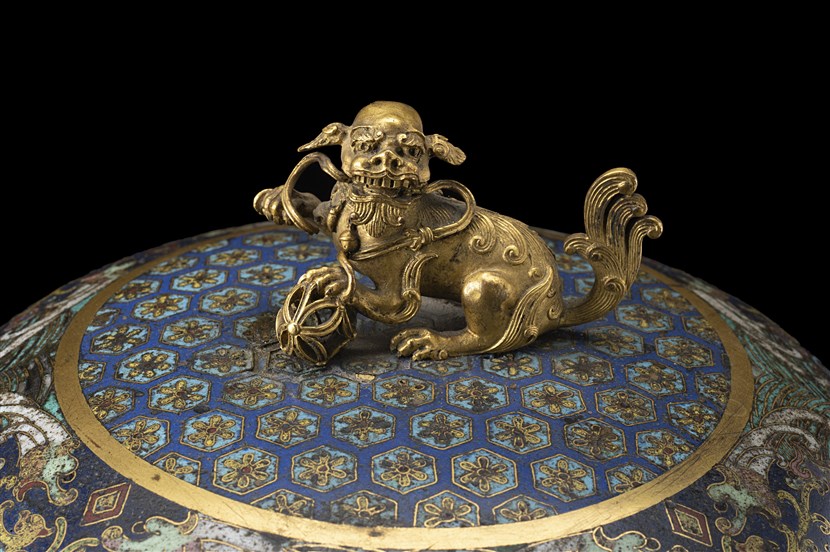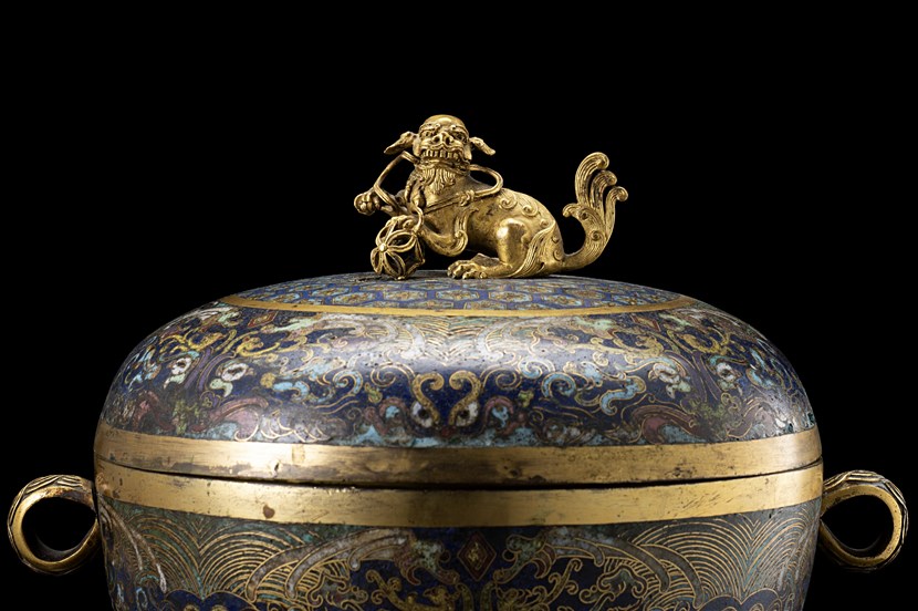 Coppa biansata con coperchio in metallo cloisonné, dalla forma arcaica dou, decorata a a maschere taotie e motivi geometrici in toni vividi, il coperchio sormontato da leone buddhista con palla di broccato in bronzo dorato, alla base marchio Jingtai