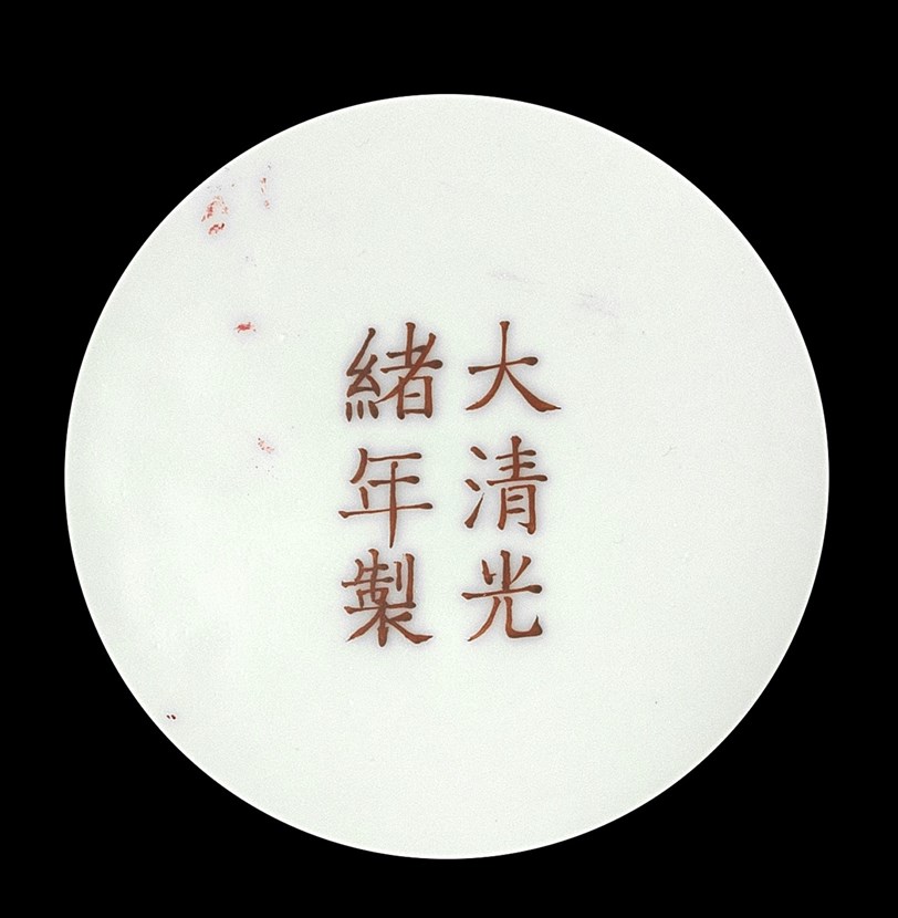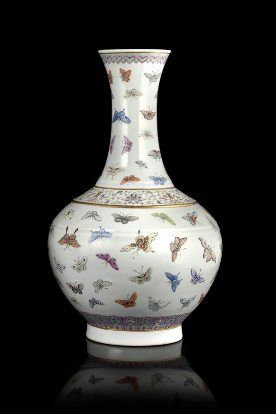 Vaso in porcellana Famiglia Rosa decorato con il motivo delle "cento farfalle", con corpo globulare, che sale da un piede dritto a un collo alto svasato al bordo, raffinatamente smaltato con il motivo delle "cento farfalle", diviso da un'ampia fascia di caratteri dorati shou intervallati da rametti di loto stilizzati, il bordo circondato da una fascia ruyi e il piede con pendenti su fondo turchese, la base con un marchio Guangxu a sei caratteri in rosso ferro