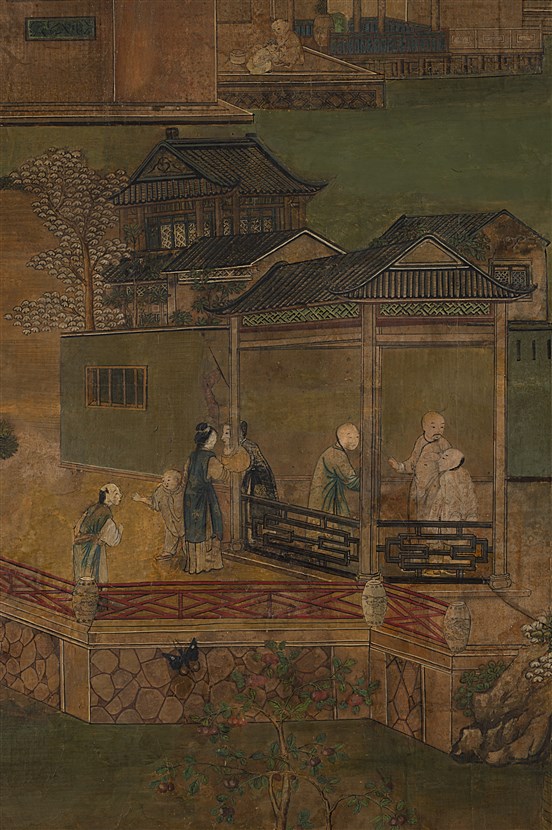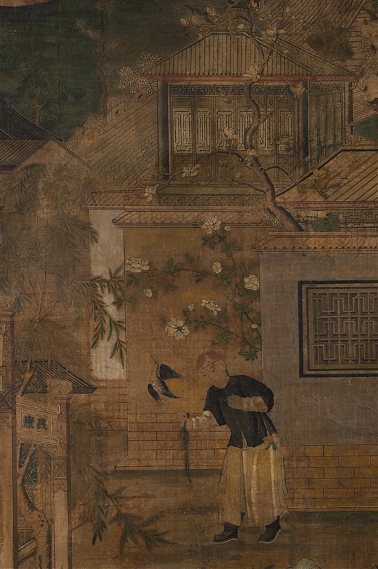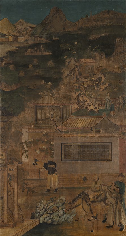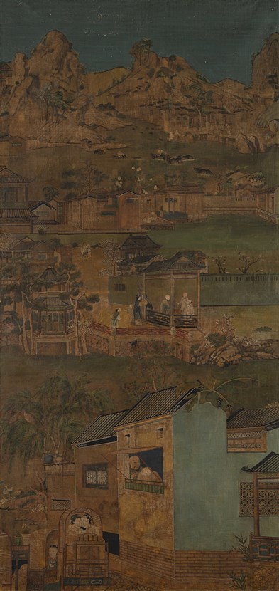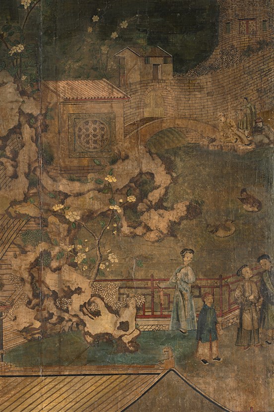 Two painted wallpaper panels, depicting a river and mountain landscape and figures by pavilions, ink and colours on paper, lined on canvas (defects)