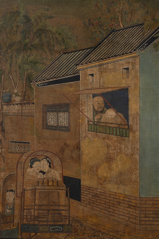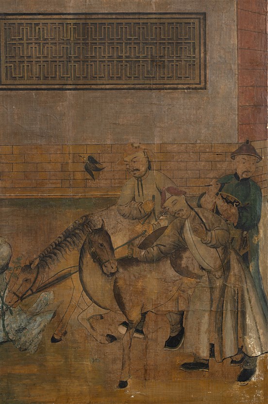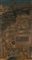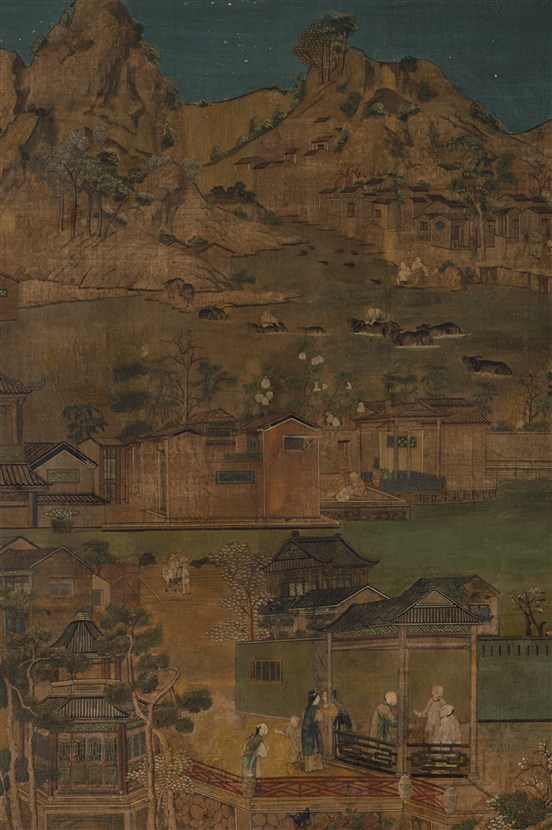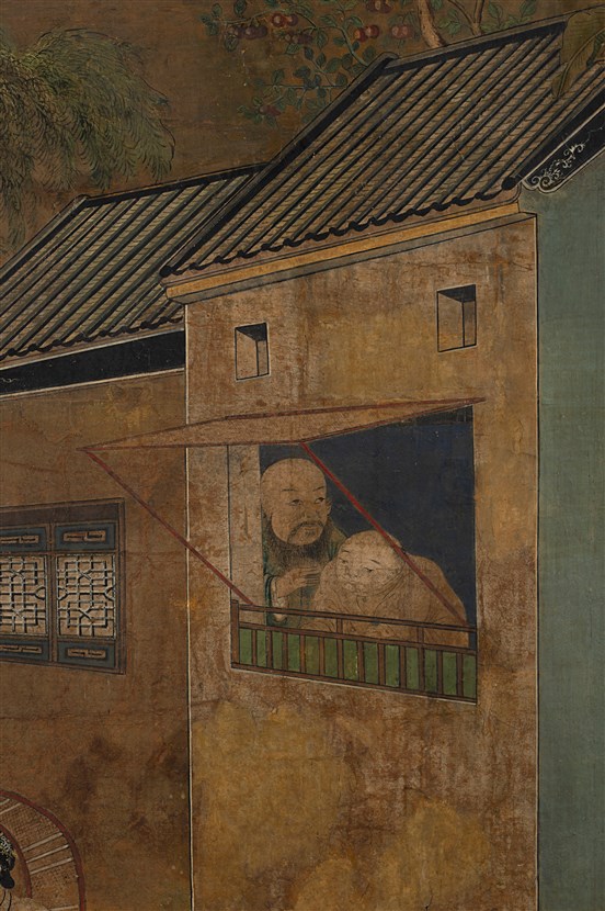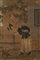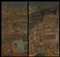 Due pannelli da parete dipinti con paesaggio montano con fiume e figure tra padiglioni, inchiostro e colori su carta intelata (difetti)