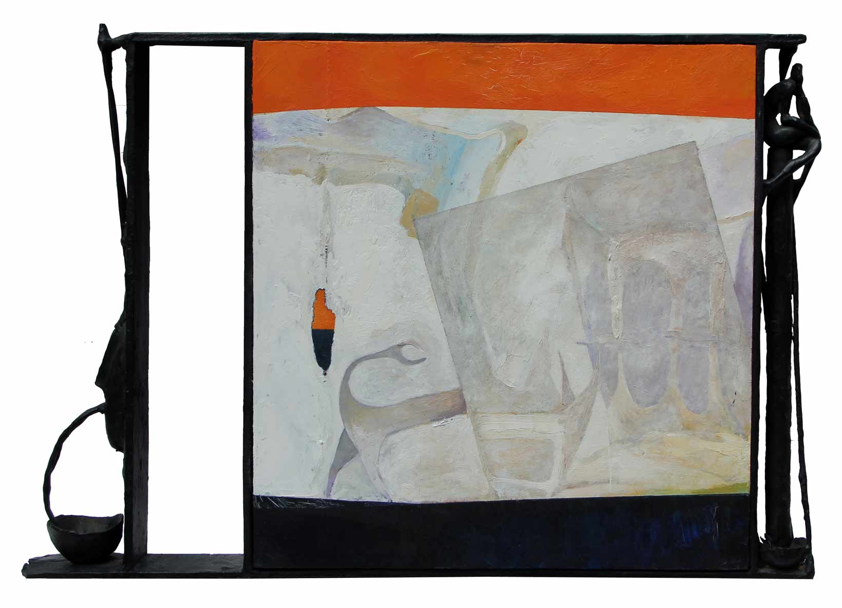 MARANIELLO Giuseppe Napoli 1945 Storie orizzontali, 1998 olio su tavola e bronzo, cm. 40 x 60 x 6 Firma, data, titolo 'Maraniello, 98, Storie orizzontali'; etichetta galleria Arte Effe, Lecco (al retro) Autentica dell'artista su fotografia