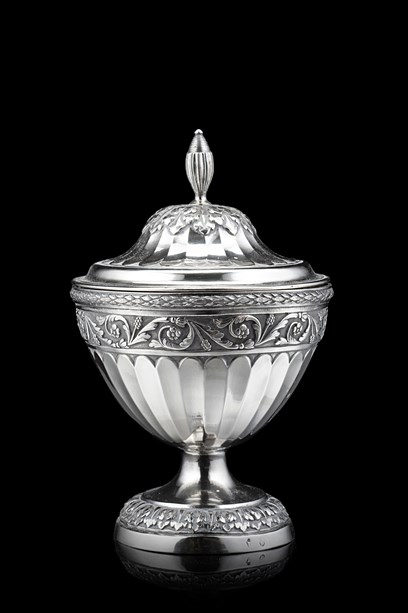 Zuccheriera in argento a corpo costolato e sbalzato a girali vegetali, coperchio con presa a pigna a tutto tondo. Genova, fine secolo XVIII/inizio secolo XIX (h. cm 21) (g 460 ca.)
