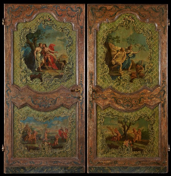 Coppia di pannelli in legno laccato e dipinto a volute nei toni del verde, riserve con scene mitologiche raffiguranti Apollo e Dafne, Diana e Atteone e putti in paesaggi. Al retro vasi e mazzi fioriti. Secolo XVIII (cm 102x205) (difetti, montati su porte moderne)
