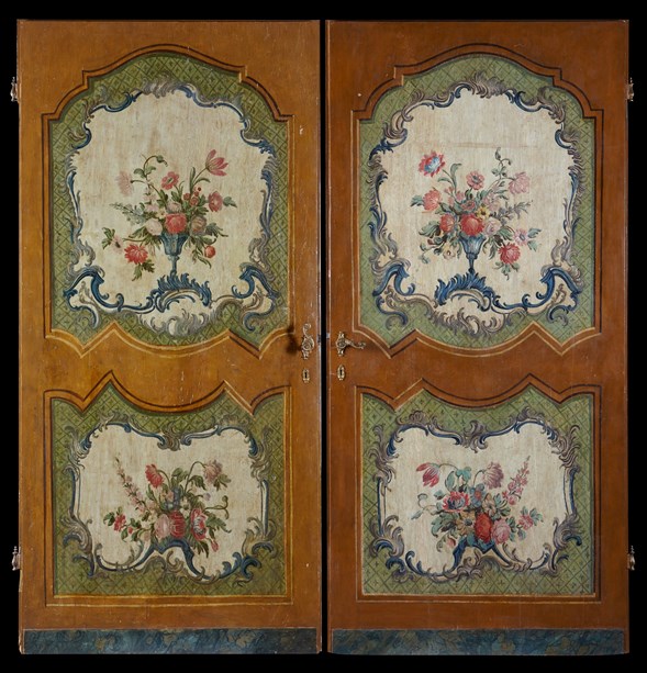 A pair of 18th-century lacquered and painted wooden panels (cm 102x205) (defects, mounted on modern doors)