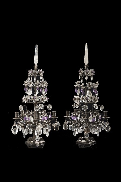 Coppia di girandolles in metallo bianco decorate con pendenti in cristallo di Rocca, ametista e quarzo fumè a fiori, foglie e frutti. Secolo XIX (h. cm 72) (difetti)