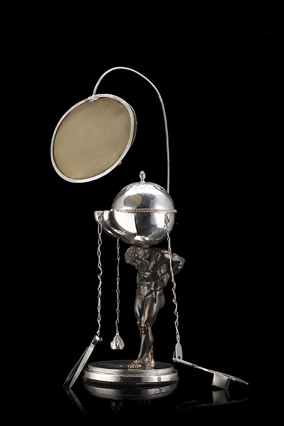 Lucerna in argento di forma sferica ad una fiamma sorretta da figura di Ercole