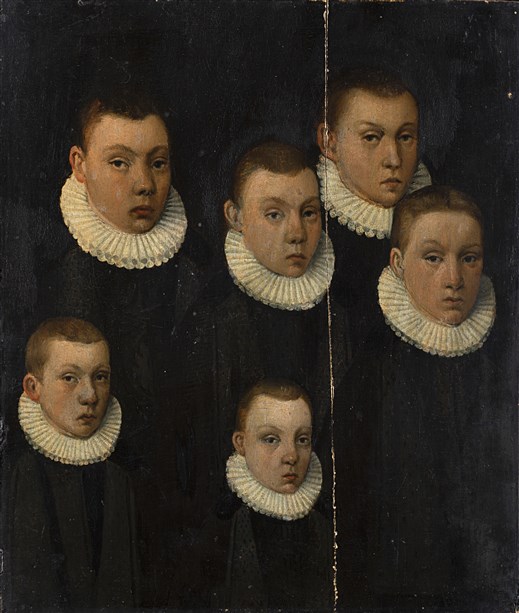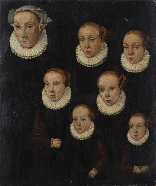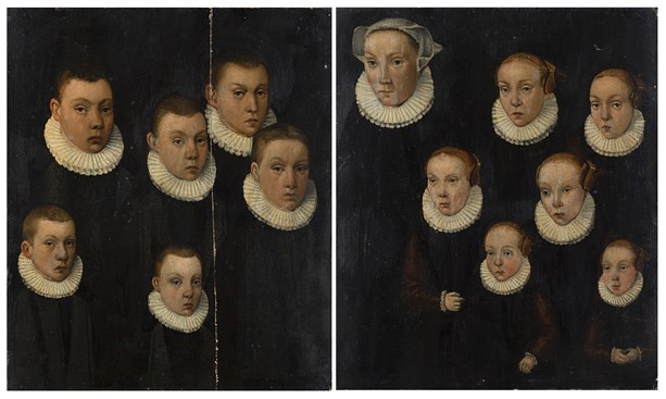 Scuola fiamminga del secolo XVII Ritratti familiari Coppia di dipinti ad olio