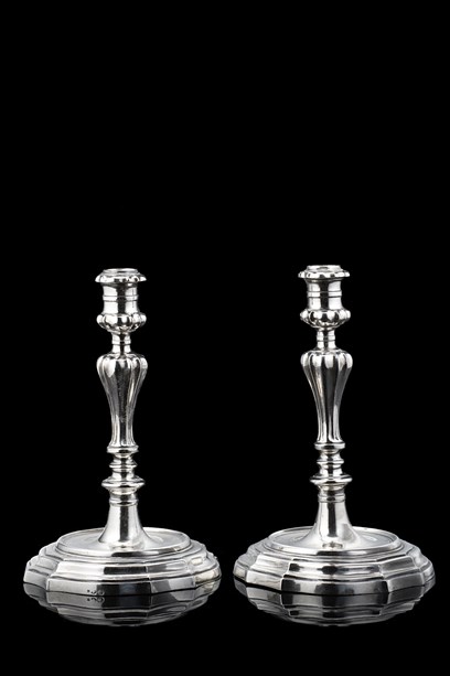 Coppia di candelieri in argento con fusto tornito e scanalato poggiante su base sagomata. Firenze, secolo XVIII (h. max cm 19 ) (g tot. 710 ca.)