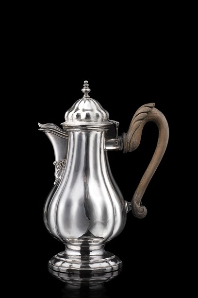 Caffettiera in argento a corpo piriforme costolato poggiante su base sagomata. Versatoio decorato con foglie, ansa sagomata in legno. Mantova, 1770 ca. Argentiere Giovanni Bellavite (h. cm 24) (g lordi 480 ca.)