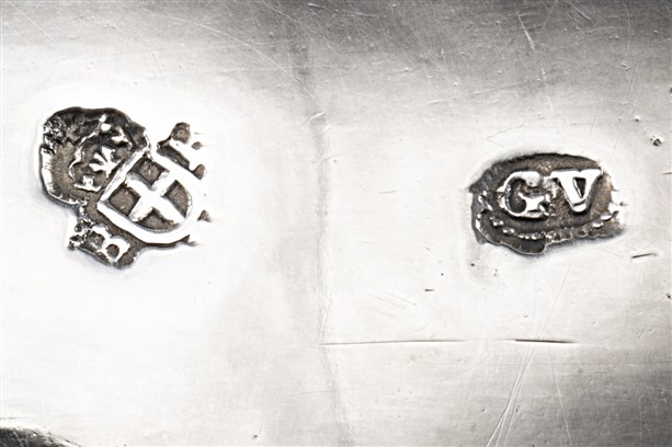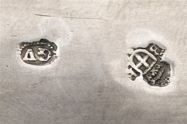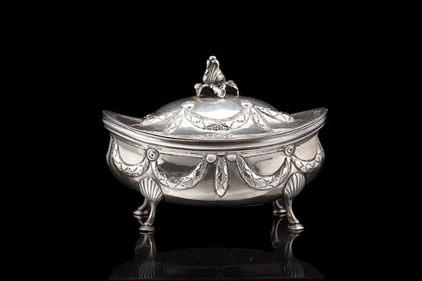 Zuccheriera a barchetta in argento sbalzato e cesellato a festoni, poggiante su quattro piedi caprini. Torino, 1778 - 1793. Assaggiatore Bartolomeo Bernardi, controassaggiatore Giuseppe Vernoni (h. cm 12) (g 288 ca.)