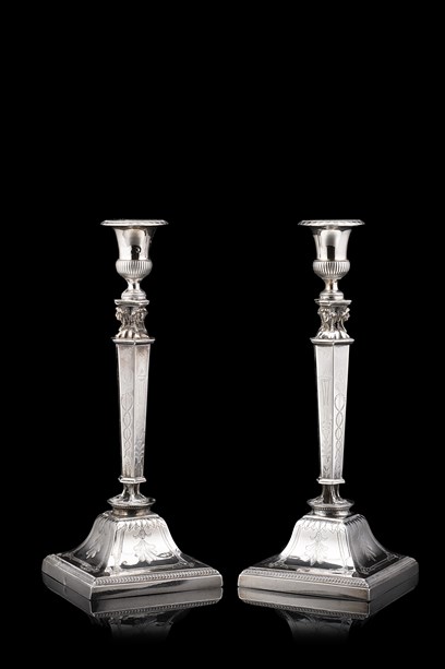 A pair of silver candlesticks. Paris, early 19th Century. Silvermith Pierre Paraud (h. cm 27) (g 1050 ca.)