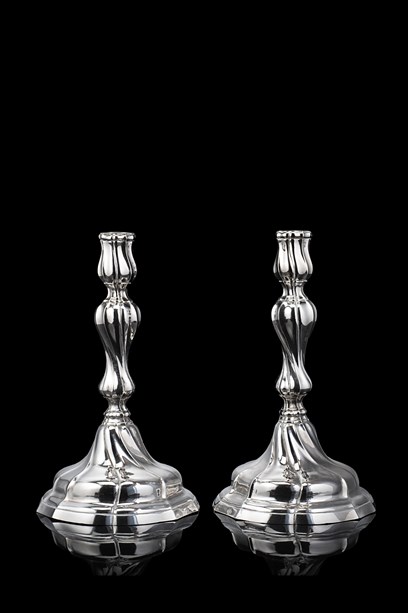 A pair of silver candlesticks. Spuroius marks of Turin, 1770, and of the silversmith Giuliano Gabriel Marcello (h. cm 25) (g 960 ca.)