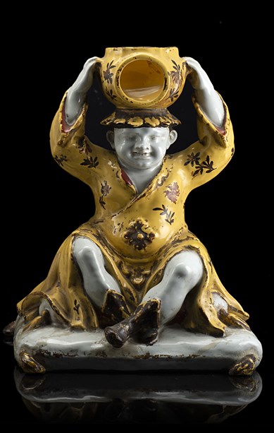 Manifattura di Felice Clerici, Milano, 1750 circa. Coppia di magot portaorologio, uno in maiolica bianca decorata a freddo in oro, l'altro in maiolica policroma (h. cm 34 ca.) (restauri)